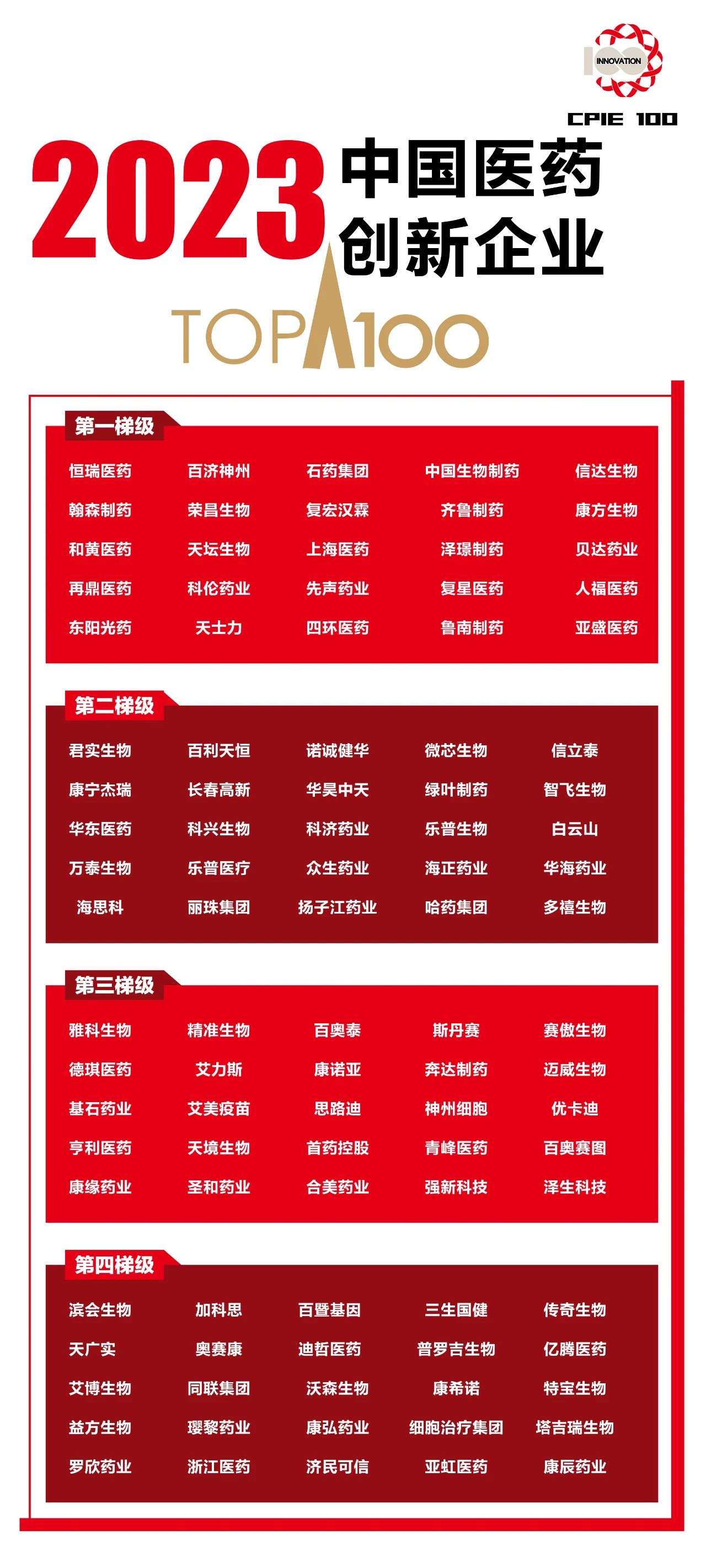 2023年10月11日,E药经理人发布“中国医药创新企业100强”榜单,中国生物制药再次入选并位列第一梯级。该榜单自2019年首次发布以来,已陆续在发布5年,中国生物制药凭借优秀的研发创新能力以及颇具竞争力的创新成果,陆续在5年位列该榜单第一梯级。