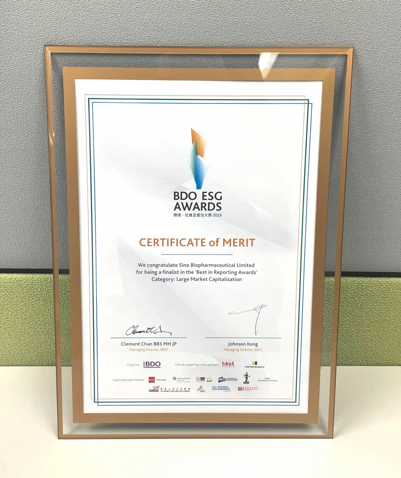 BDO环境、社会及管治大奖自2018年设立,迄今已陆续在举办五届。该奖项的设立旨在表扬于环境、社会及管治(ESG)范畴上表现突出并有持续影响的香港上市公司设立,鼓励企业将可持续开展深度融合于业务运营,藉以更高的履行社会责任。为了表彰中国生物制药2022年度在ESG管治、信息披露以及利益相关方沟通领域的卓越表现,BDO为公司颁发「最佳 ESG 报告大奖优异认证」证书。
