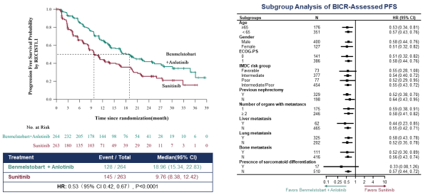 ETER100最新研究数据[11]显示,安罗替尼联合贝莫苏拜单抗组(下称试验组)和对照组的中位PFS分别为18.96个月和9.76个月,试验组显著延长了患者的PFS(图1左)。大部分亚组显示可从安罗替尼联合贝莫苏拜单抗治疗中取得显著PFS获益(图1右)。提示安罗替尼联合莫苏拜单抗有望在临床上延长肾细胞癌患者的生存获益。
