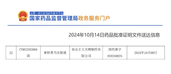 10月14日,中国国家药品监督管理局(NMPA)官网显示,中国生物制药(1177.HK)下属企业南京正大天晴抗病毒领域产品——来特莫韦注射液获批上市,为该品种国内首仿。本品用于接受异基因造血干细胞移植(Allo-HSCT)的巨细胞病毒(CMV)血清学阳性的成人受者[R+]预防巨细胞病毒感染和巨细胞病毒病。