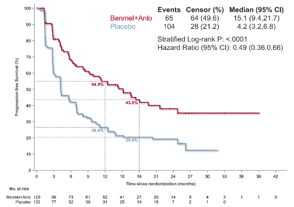●试验组1:中位PFS 为15.1个月,对照组4.2个月(HR=0.49, 95%CI 0.36-0.66, P<0.001),疾病进展或死亡风险降低51%。