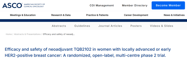 [5] Junjie Li, Qingyuan Zhang, Xiaohua Zeng, et al. Efficacy and safety of neoadjuvant TQB2102 in women with locally advanced or early HER2-positive breast cancer: A randomized, open-label, multi-centre phase 2 trial.2025 ASCO(#591).