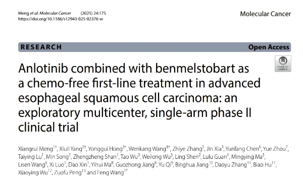 [1] Meng, X., Yang, X., Hong, Y., et al. Anlotinib combined with benmelstobart as a chemo-free first-line treatment in advanced esophageal squamous cell carcinoma: an exploratory multicenter, single-arm phase II clinical trial. Molecular Cancer, (2025) 24:175.