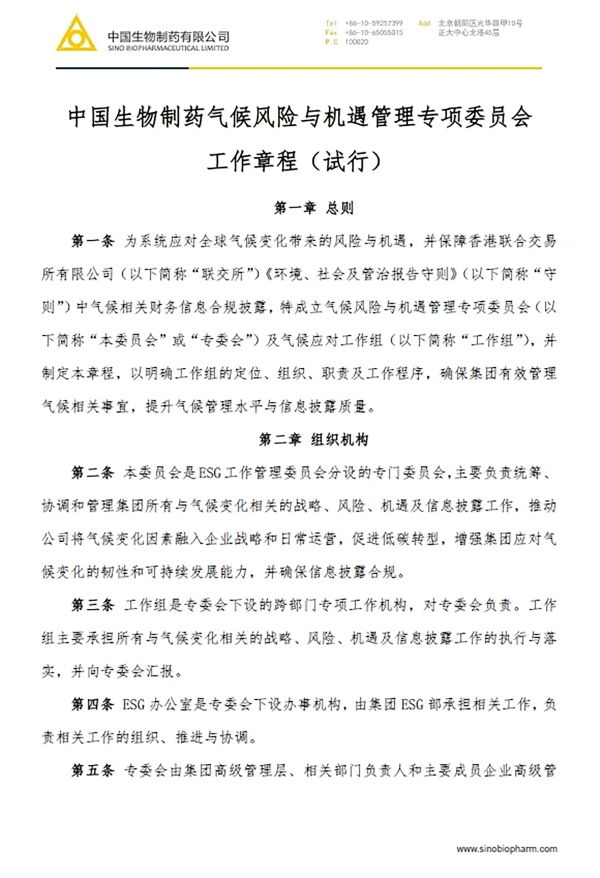 气候变化是全世界共同面临的严峻挑战。中国生物制药将以研发创新与低碳技术为双轮驱动,以高水平ESG管理为牵引,统筹开展与安全,持续应对气候挑战,抓住低碳转型机遇,坚定不移地走稳健运营、创新驱动、绿色低碳的高质量开展道路,持续践行行业领军企业的使命与担当。
