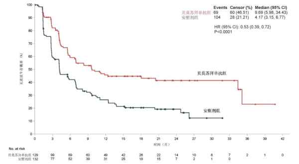 ● 中位随访时间19.4个月,接受贝莫苏拜单抗巩固治疗的患者中位PFS为9.69个月,安慰剂组4.17个月(HR=0.53,95% CI 0.39-0.72,P<0.0001),疾病进展或死亡风险降低47%;