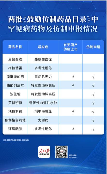 人民日报健康客户端梳理发现,在9个罕见病药品中,溴吡斯的明、曲前列尼尔、地拉罗司、环磷酰胺4种药品已有国产仿制药获批上市,其余5种药品中,有3种药品已有仿制药在申请注册上市,尼替西农、格拉替雷2种药品国内尚无药企提出仿制申请。