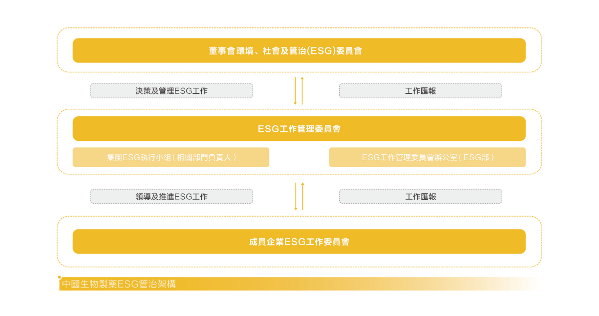 中国生物制药持续完善ESG管治架构,以董事会为ESG最高责任、决策及监管组织,建立董事会层级的环境、社会及管治(ESG)委员会,以监督本集团ESG相关重大事宜,并就ESG风险、机遇、政策和行动等向董事会给予建议。在ESG管理层面,本集团创建ESG工作管理委员会,由集团高级管理人员担任常务委员,集团ESG相关职能部门负责人及部分主要成员企业负责人担任委员,负责持续完善ESG风险的内部监管,组织落实董事会ESG策略及要求,及时根据宏观环境及业务变化等因素审视ESG风险与机遇,定期审阅ESG年度工作报告及ESG相关信息披露内容。为配合ESG管理工作的落地,集团设立 ESG专职管理部门——ESG部暨ESG工作委员会办公室,负责协调、统筹、组织及推进各项ESG工作任务的执行。集团制定《中国生物制药ESG工作管理委员会章程》《中国生物制药可持续管理制度》,对以上ESG管治架构相应职责及工作机制予以规范。