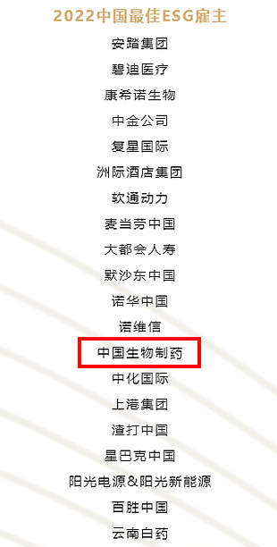 全球知名的专业服务组织怡安集团近期正式发布首届中国最佳ESG雇主榜单,中国生物制药(HK.1177)凭借卓越的 ESG 管理表现荣膺 “2022中国最佳ESG雇主”。